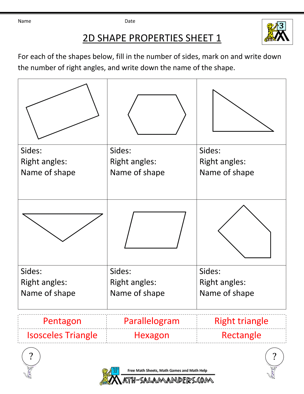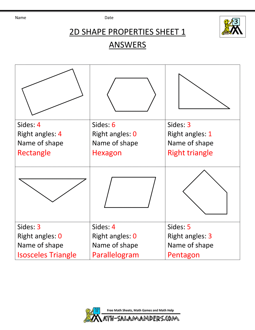 math 2d grade 3rd worksheets shape properties practice printable shapes geometry salamanders answers sheet third right names pdf mathematics triangle